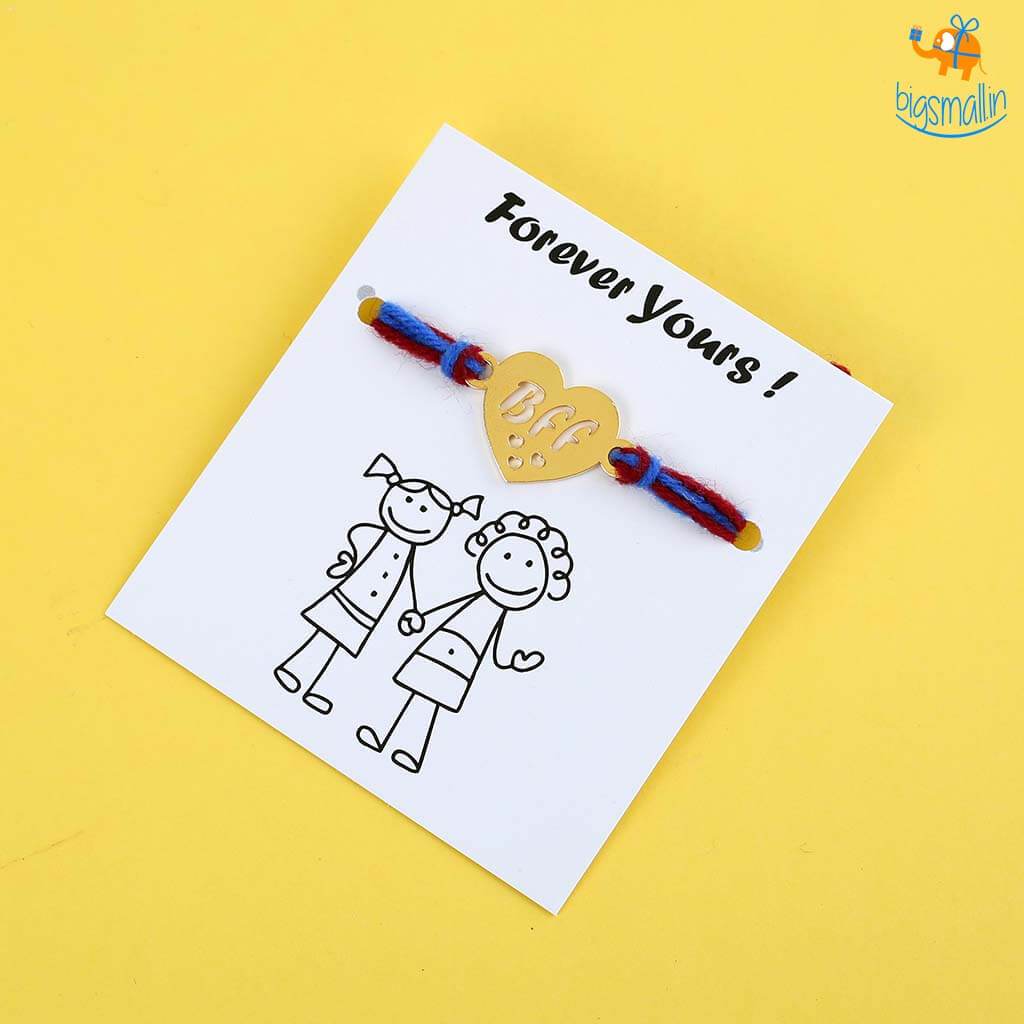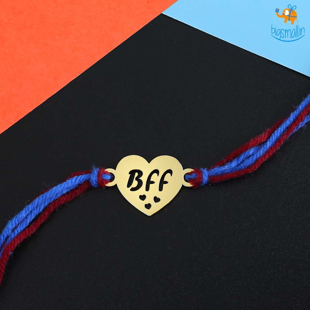 - Knot Rakhi with heart-shaped design and the words BFF inscribed