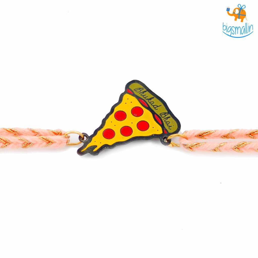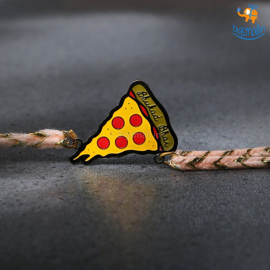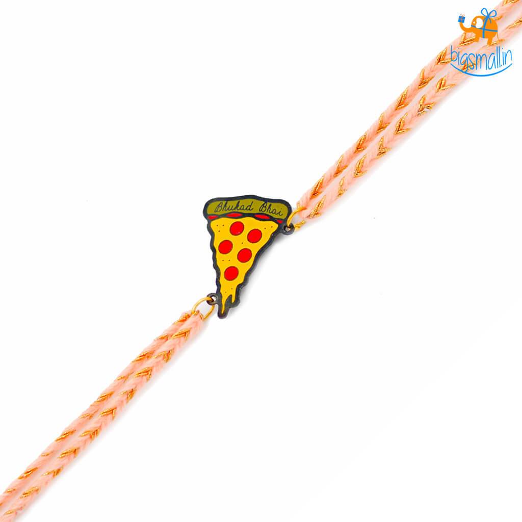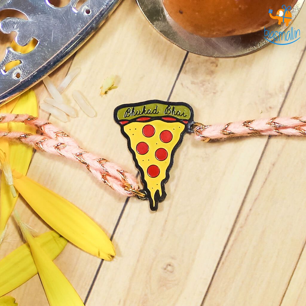 If the word, "Bhukkad Bhai" rings a bell, then probably you have spent half your childhood hiding chocolates from this fellow, because whatever you ate this fellow had to have a bite right from your plate. This rakshabandhan take a break from the generic red threads and gift him the personality specific Bhukkad Bhai Rakhi. With a slice of pizza themed brass metal sheet in the center of a beautiful peach thread and golden entwined strings, this rakhi will crack you up both.