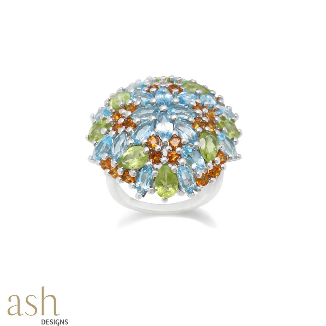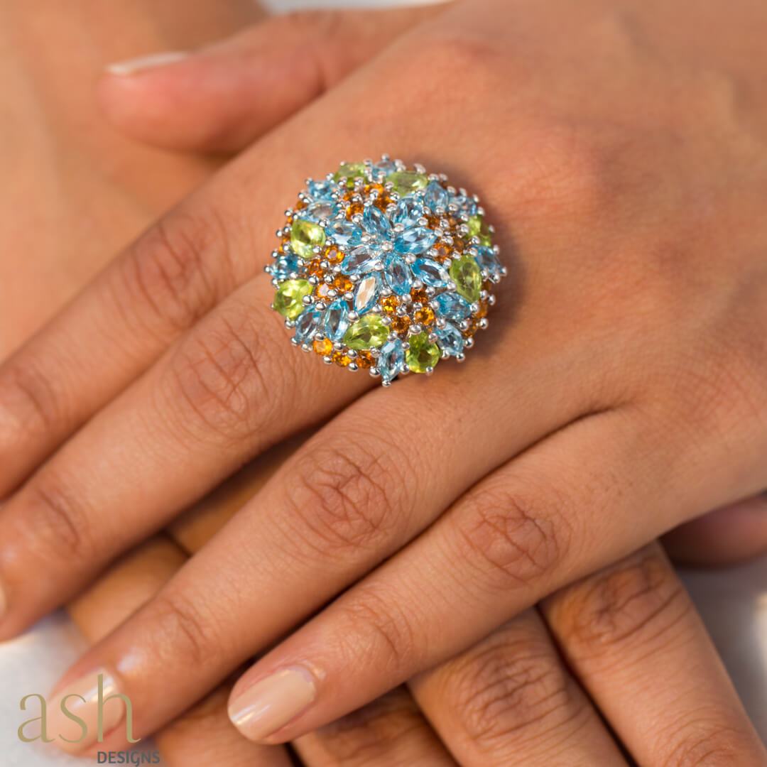 Bora Bora ring is inspired by the lands, trees, and sky depicted by the magical craftsmanship of citrine, blue topaz, and peridot gemstones set in sterling silver creating this earthy concoction. Marquis and round-cut gemstones set in silver. The ring will look beautiful on your lady whether she is out for brunch with friends or going to a wine tasting party.