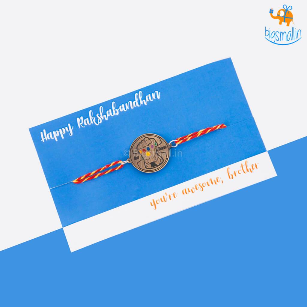 If you remember saying, "You don't know who my brother is!' every time someone dare mess with you, you would relate to the, Bro Power Rakhi. With a brass sheet embellishment, depicting the Infinity Stone gauntlet, this endearing rakhi is designed to delight and cement your bond of love further. One click of the wearer's fingers and all the wrongdoers will perish.