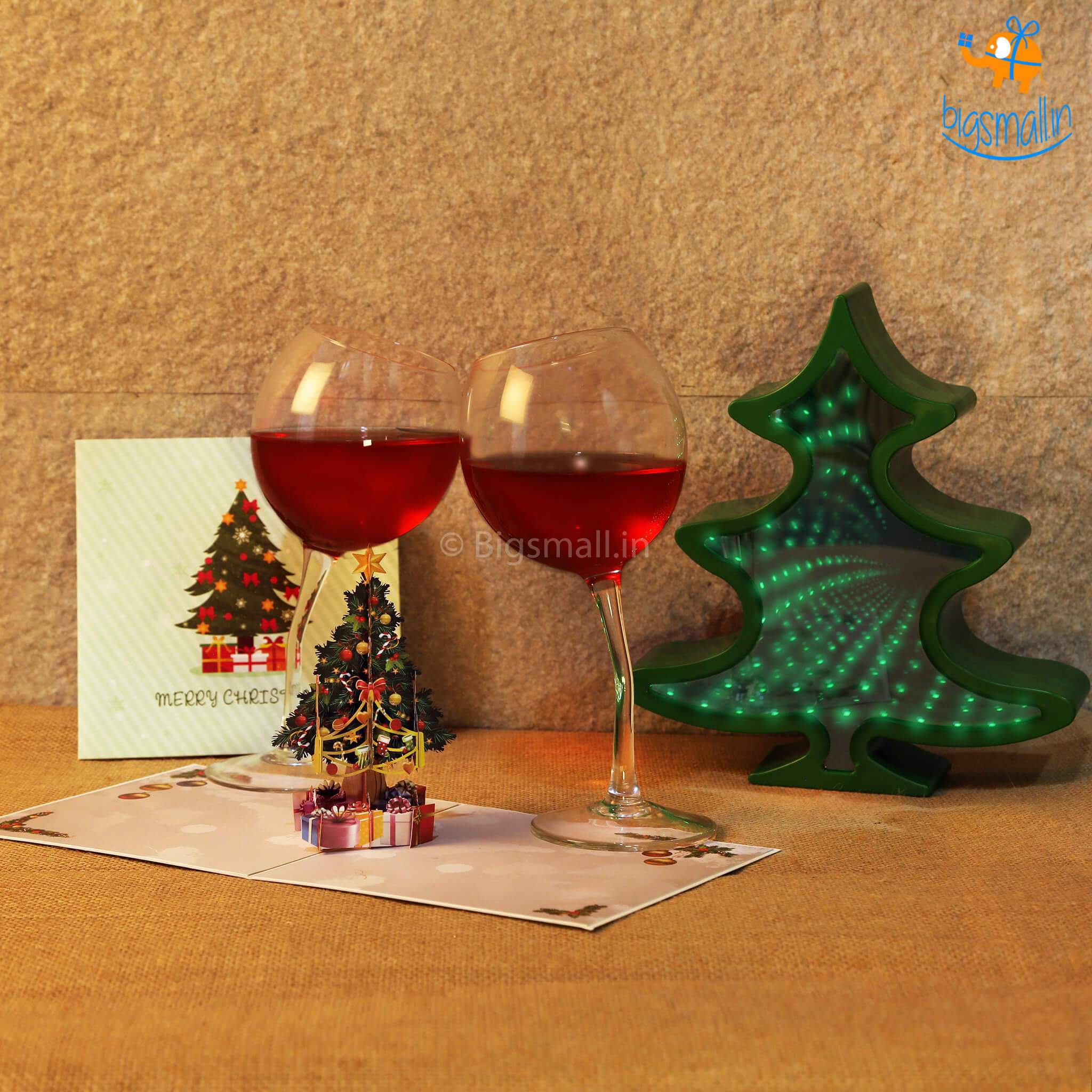 Said Francis of Assisi... Ring in the Yuletide spirit with the holly, jolly Christmas Gift Set. The package is inclusive of Merry Christmas 3D POP Card, Tipsy Glasses - Set of 2, and Christmas Tree Mirror Lamp. Present this package of goodies to your friends and family this Christmas and let them know how much they brighten up your lives. The beautiful green cover of the Merry Christmas pop up card is tranquil and hints at the scene inside. Once opened a Christmas tree emerges from the center of the pop-up card. A beautifully decorated Christmas tree is at the center and is surrounded by wrapped Christmas presents. Beautifully detailed and reminiscent of a collectible Christmas tree, this pop-up card is breathtaking. Get the party going with Tipsy glasses that have a capacity of 350ml. These glasses are not dishwasher or microwave safe. Their curved alignment would definitely be everyone's favorite and the life of every party you throw. Lights are an integral part of Christmas. Usher in this one with the Christmas tree infinity lamp. It can be used as a mirror when switched off and works as a lamp when switched on - giving a beautiful 360-degree optical illusion while lighting up your room colorfully.