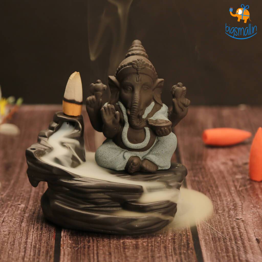 An incense burner paired with a statue of Lord Ganesha. You can place an incense cone at the top, and the burner is designed in a way that spreads the smoke in a reverse direction, creating an illusion of a smokey waterfall. Unlike the regular incense burners, here the smoke flows downwards. The smoke mixes in the air to infuse fragrance and creates a divine feeling in the atmosphere enkindling a feeling of  positivity  with the adorable Ganesha! This can be an ideal Housewarming, Diwali and Ganesh Chaturthi gift for anyone.