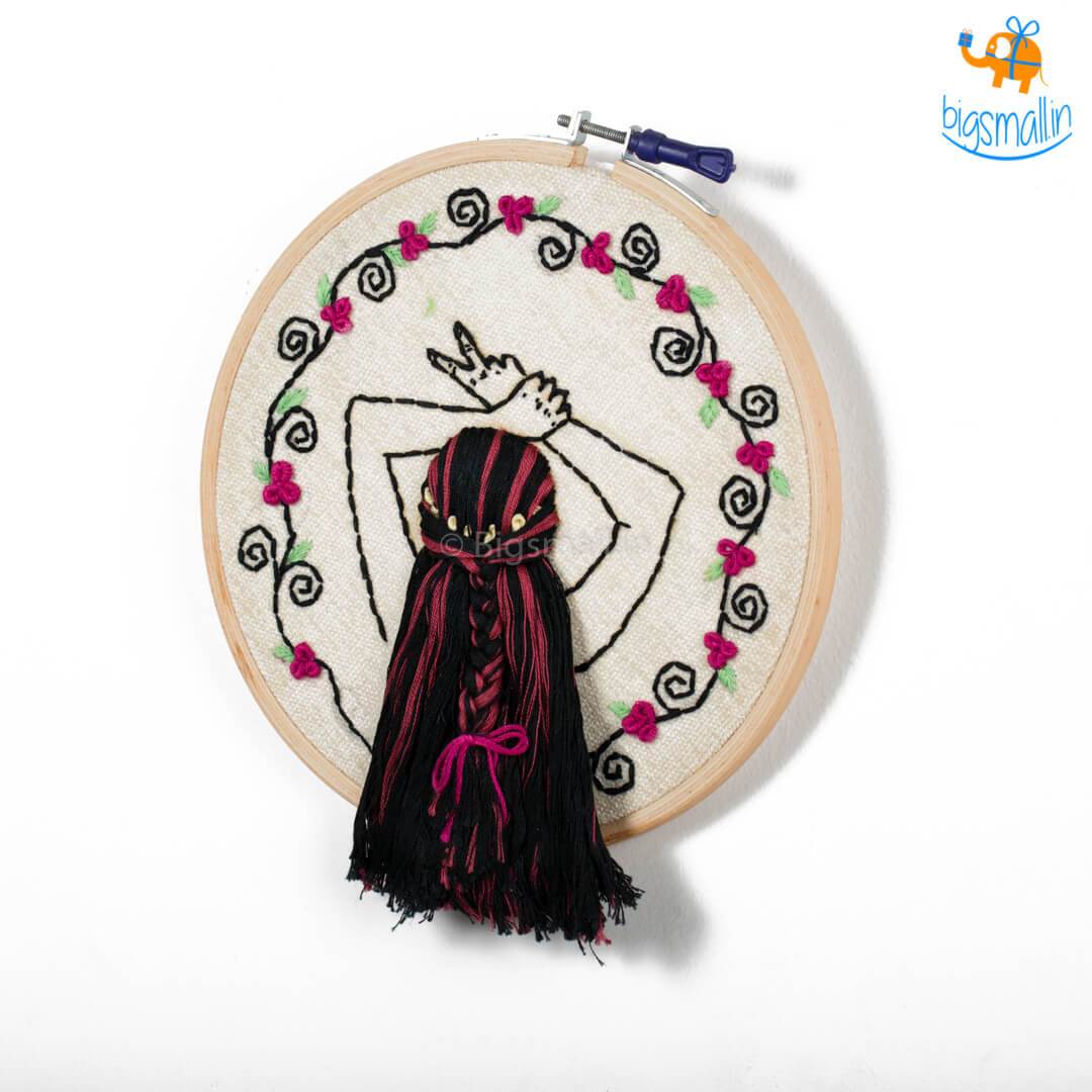 Presenting traditional art and a relatively new creative way to present it. The boho-girl embroidery hoop art will light up any corner you decide to hang it upon. The embroidery is done with bright coloured threads on an off-white fabric, making the design pop. The colourful flowers and hair make the design look more cheerful. You can easily hang the hoop with the support of the screw and nut. The hoop will look great placed on a bookcase or hanged above your coffee table. Gift the art to an embroidery enthusiast or somebody who likes to display decorated textile in their home.