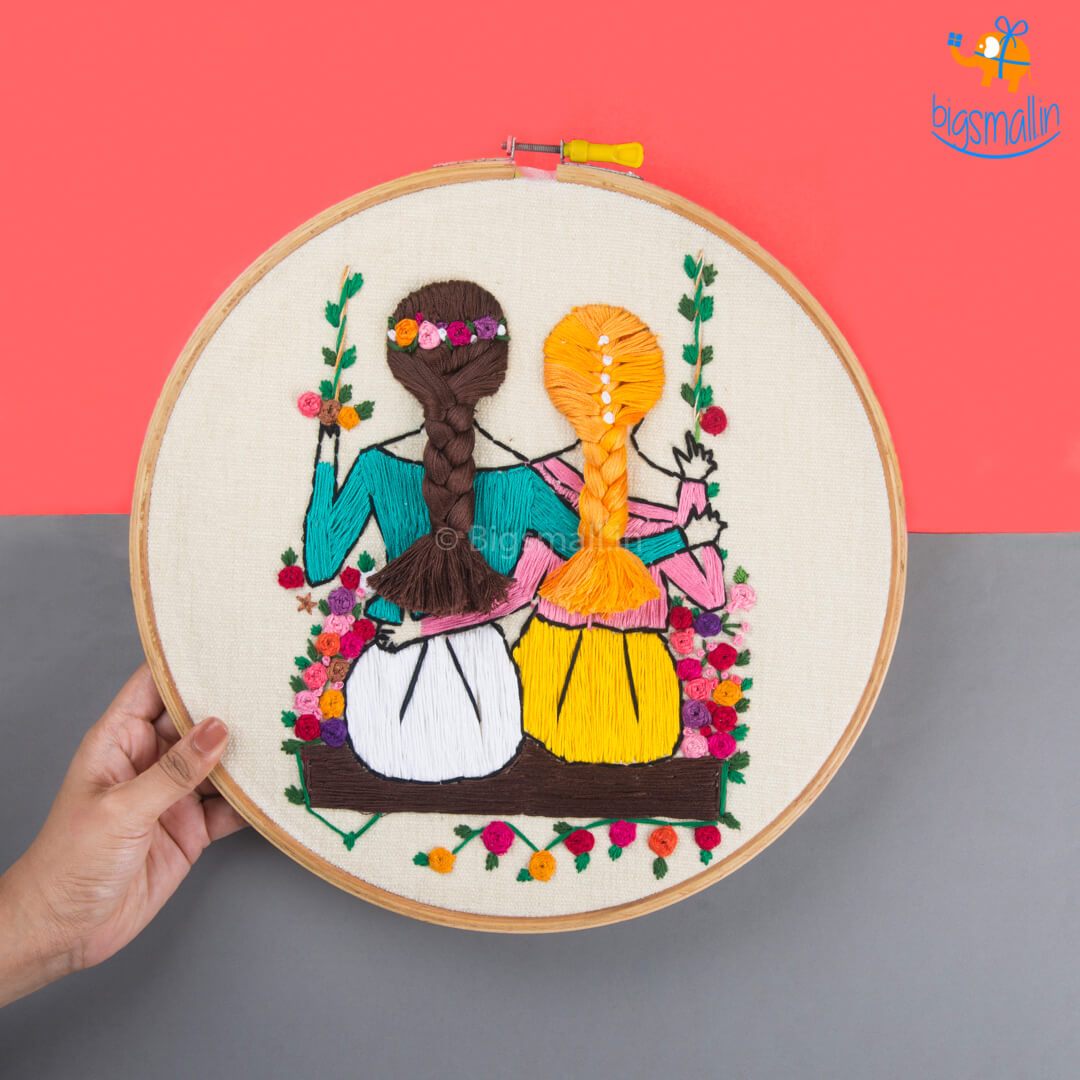 Presenting traditional art and a relatively new creative way to present it. The friends on a swing embroidery hoop art will light up any corner you decide to hang it upon. The embroidery is done with bright coloured threads on an off-white fabric, making the design pop. The colourful outfit and the flowers make the design look more cheerful. You can easily hang the hoop with the support of the screw and nut. The hoop will look great placed on a bookcase or hanged above your coffee table. Gift the art to an embroidery enthusiast or somebody who likes to display decorated textile in their home.