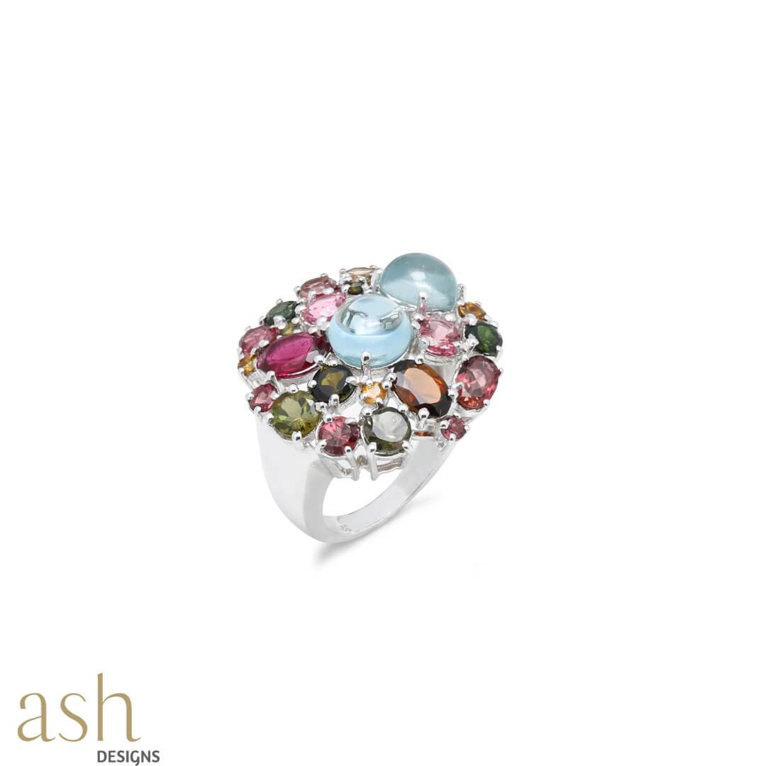 A stone for “new beginnings”, Moonstone is a stone of inner growth and strength. It soothes emotional instability and stress providing calmness. It’s also a wonderful fertility aid too. Moonstone Charm Ring features stunning round-cut tourmaline gemstones accentuated by moonstones set in silver. The cocktail ring is the perfect statement piece for a fancy night out or for a fresh summer look.