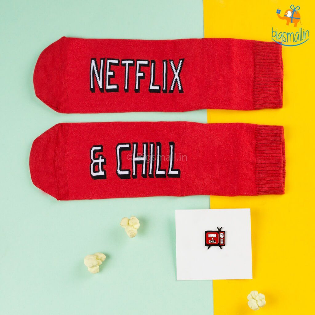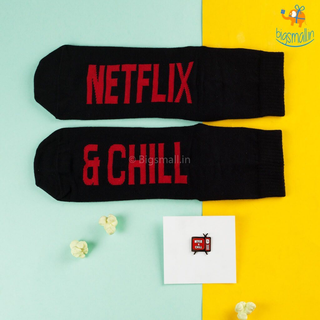 - Inclusive of a pair of Netflix & Chill socks (choose a pair in your favorite color), and a Netflix & Chill Metallic Lapel Pin