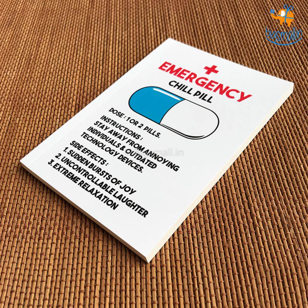 Surrounded by people you would rather not be around? Heckled? Frazzled? Chill bro with the Emergency- Chill Pill Notebook by your side. #ZeroOD guaranteed! A fun take on the oft used pun, now you know what to do when you land yourself in some deep shit. Firstly bid adieu to those pricks, secondly chuck those outdated technological devices that freeze more often than they perform. Pretend to be busy doodling away in your notebook till the wave of annoying individuals subsides. Welcome pure nirvana with some totally acceptable side effects of uncontrollable laughter, bursts of joy and did we mention? Extreme relaxation... #ChillVibes