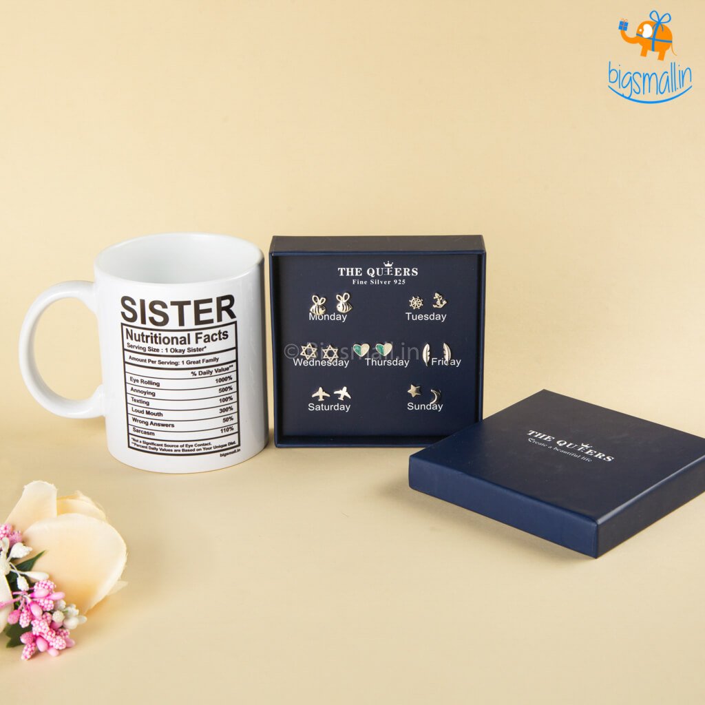 - Sister Nutritional Facts Mug and Weekly Earrings Gift Box - 7 Pcs