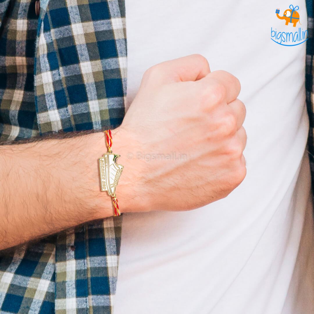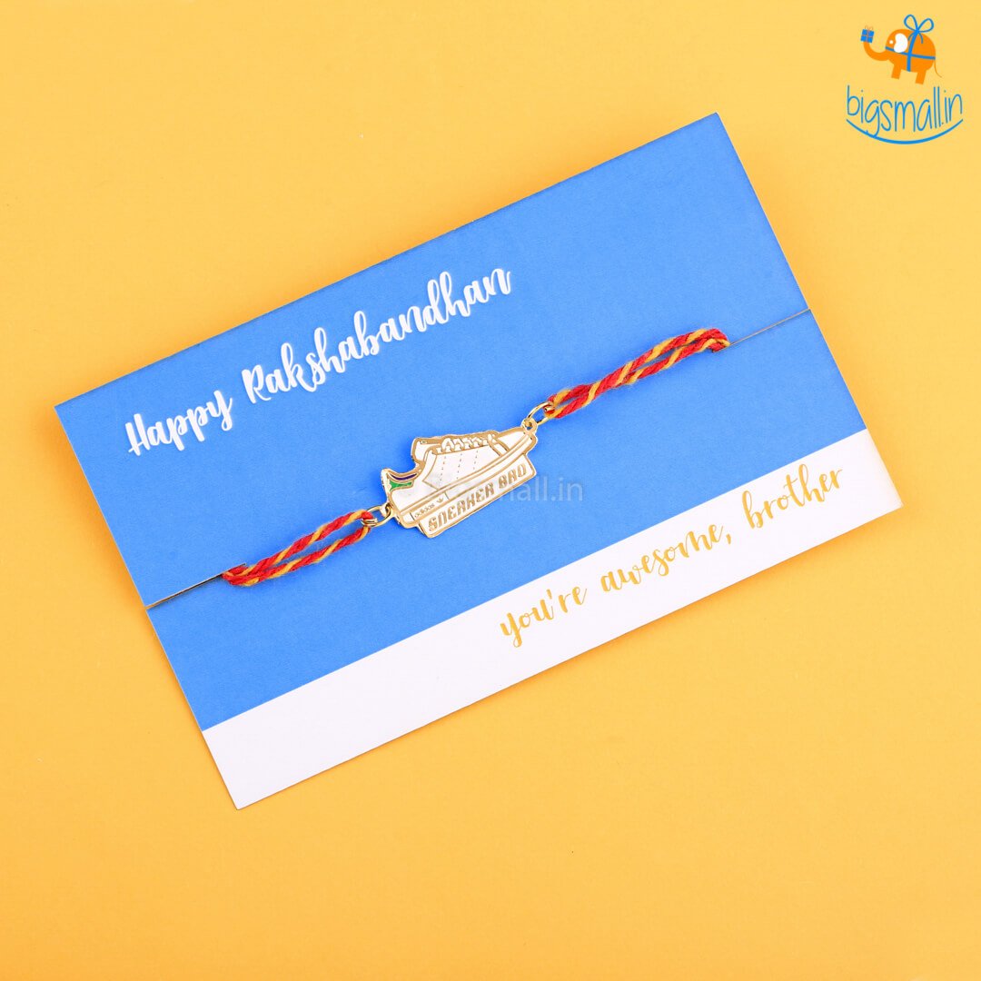 Does your brother love collecting sneakers as a hobby and tell the world about it? Or maybe he has a little bit of a hoarding problem and never accepts it? Whatever the case may be, you still love him. Celebrate his love for sneakers this Rakhi season with this personality-specific Rakhi. Sneaker Bro Rakhi that comes with a metal sheet embellishment in the shape of a - you guessed it - sneaker. Do let it slip that you have an eye for a certain shoe, maybe he'll finally give it to you.