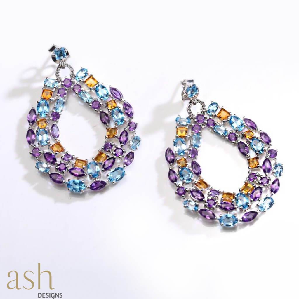 Everyone at one time or another, has marvelled at the beautiful colours of a sunrise or sunset. The concept behind designing this piece was to bring forward the magnificent spectrum of colours seen in twilight and sunset at sea. Starry Sea Teardrop Earring is a colourful ensemble of fine cut blue topaz, citrine and amethyst gemstones. Each eye-catching teardrop is carefully handcrafted with 46 natural gemstones set in sterling silver. A great gift for the lady who loves to dress to the nines.